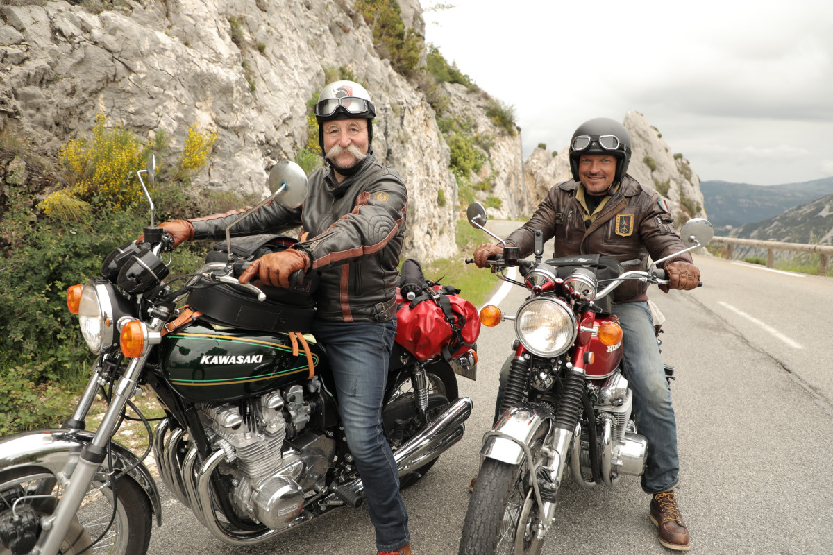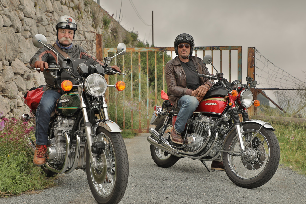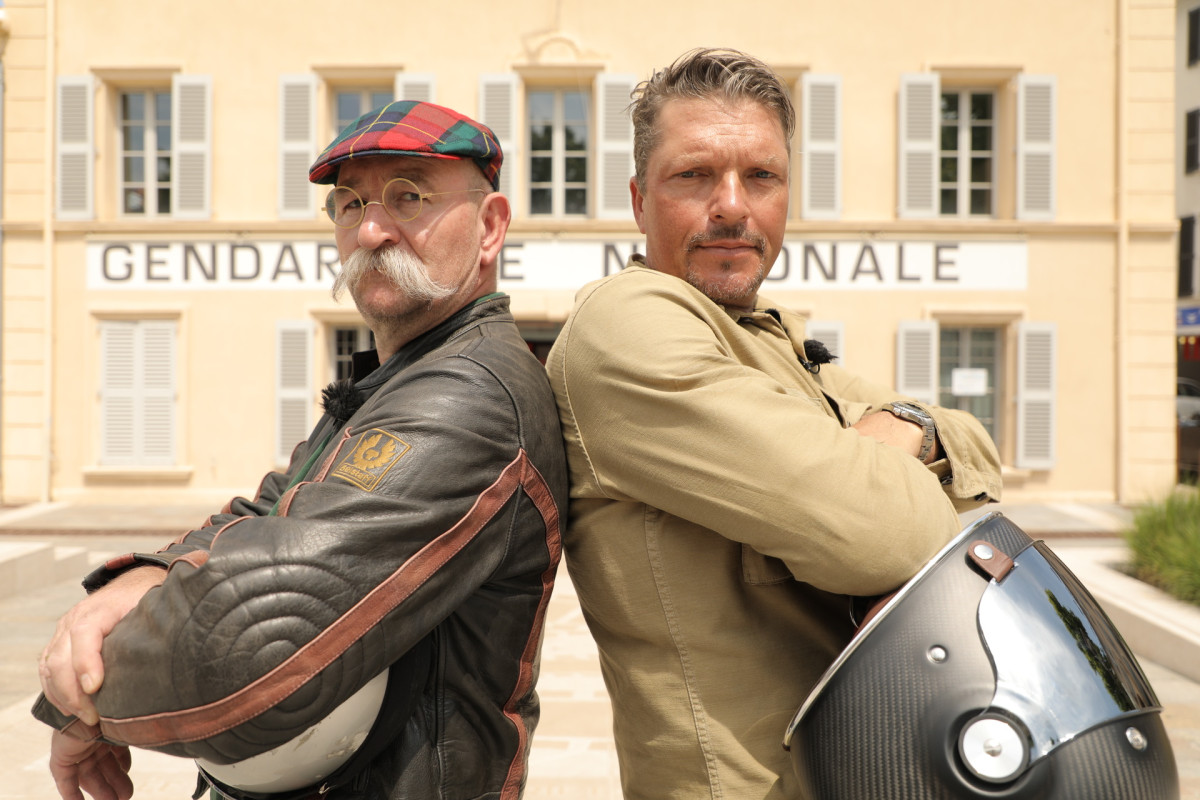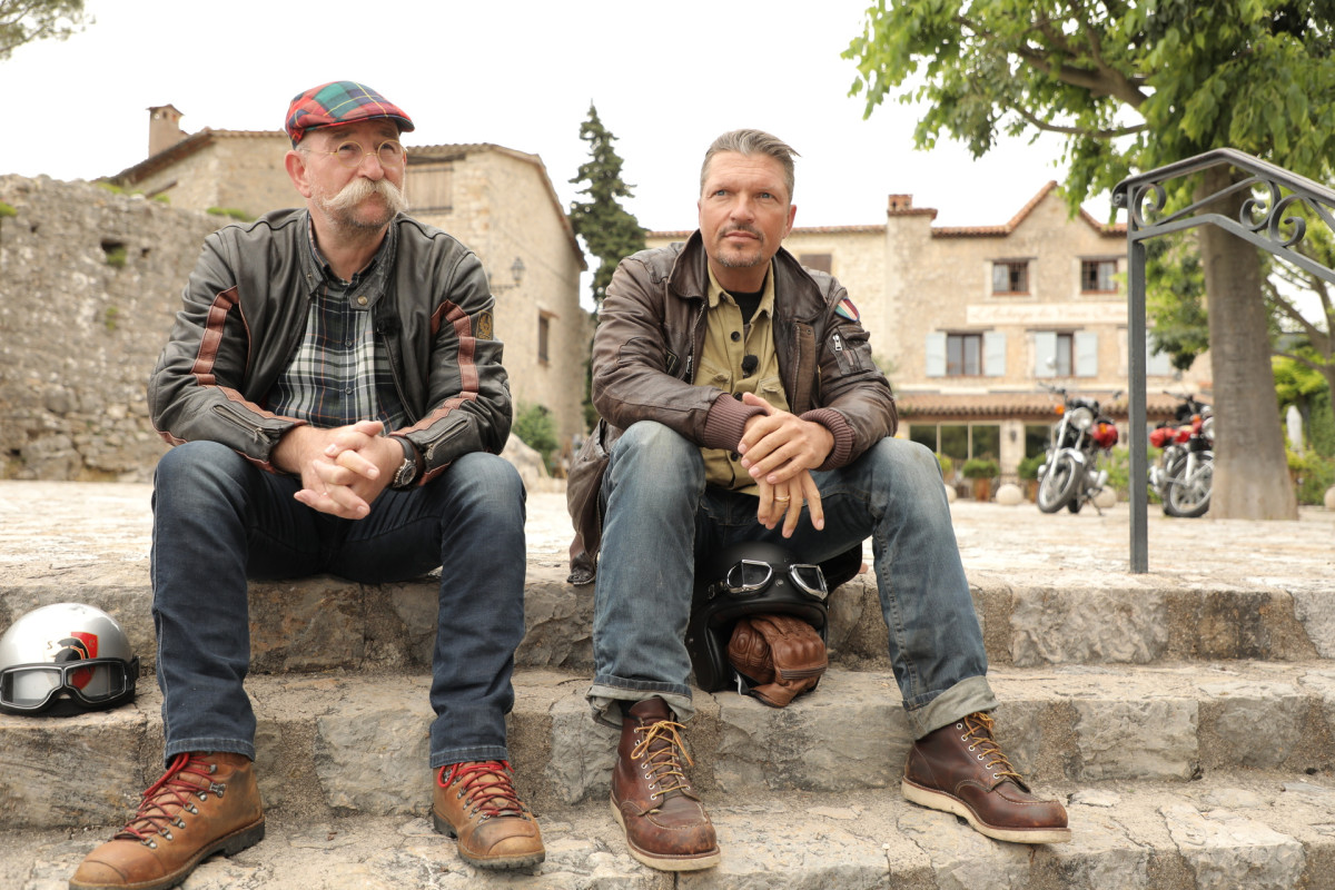 Horst Lichter und Schauspieler Hardy Krüger Jr. auf Motorrädern an der Côte d'Azur