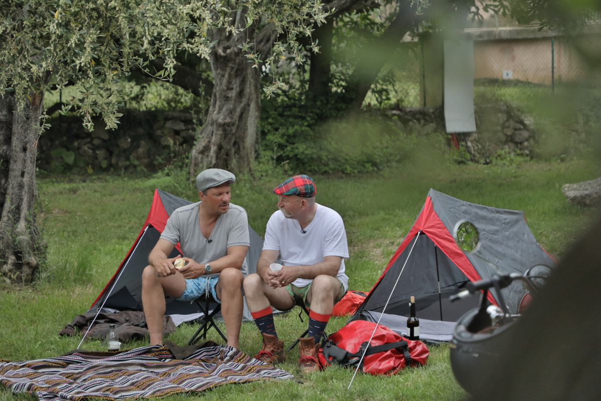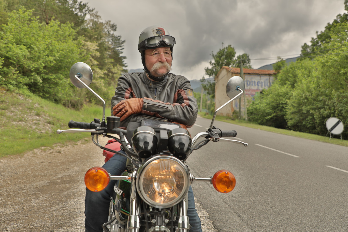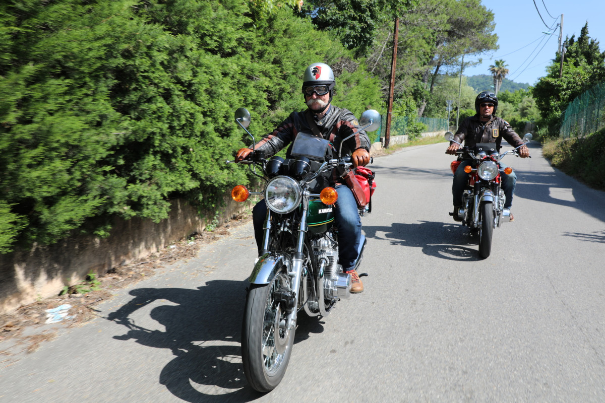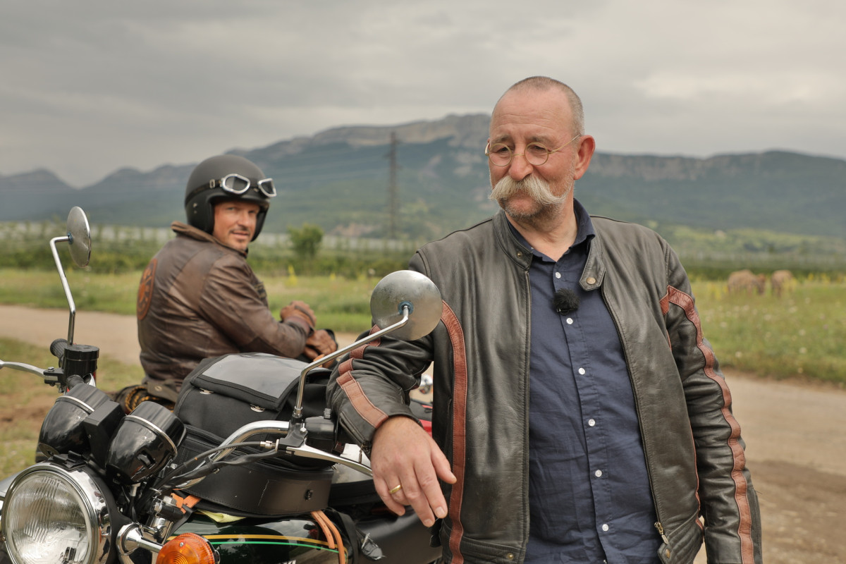 Horst Lichter und Schauspieler Hardy Krüger Jr. auf Motorrädern an der Côte d'Azur