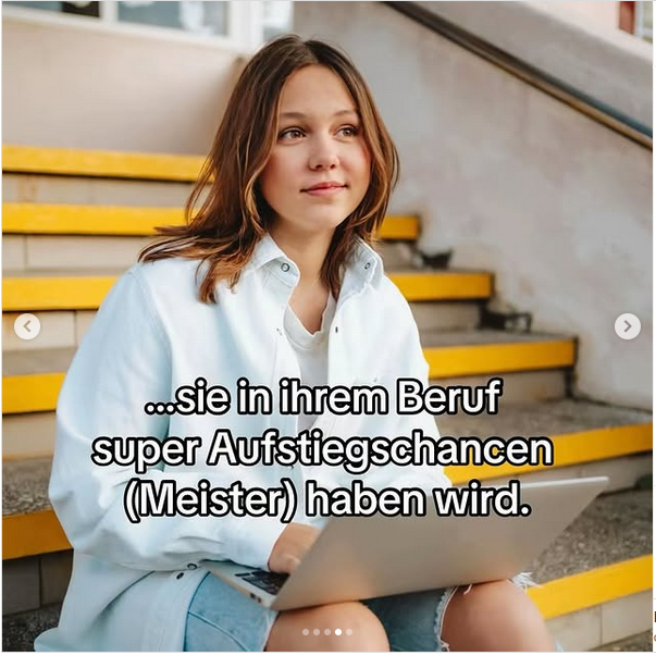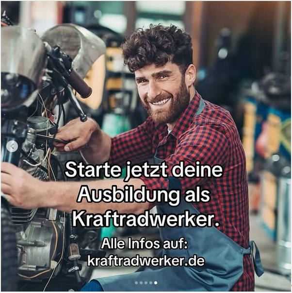 Das bildbasierte Carousel zeigt in mehreren aufeinanderfolgenden Bildern, wie das Hobby des Motorradfahrens und Motorradschraubens zu einem Berufswunsch, einer interessanten Ausbildung und schließlich zu einem erfüllten Berufsleben werden kann. Dabei steht neben der Emotionalität, die das Thema Motorrad und Roller fahren stets begleitet, auch das Vermitteln von Wissen Rund um die Ausbildung zum Zweiradmechatroniker im Vordergrund.
