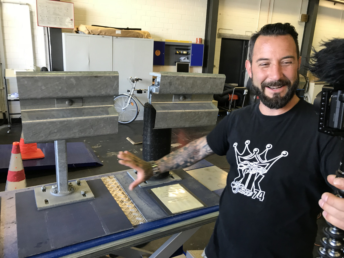 Spannende Forschung erlebte Jens Kuck bei der BASt – Bundesanstalt für Straßenwesen in Bergisch Gladbach. Dort werden im Auftrag der Bundesregierung nahezu alle relevanten Fragen zum Straßenverkehrsgeschehen erforscht und ausgewertet. Jens interessierte sich vorrangig für das Bremsen in Schräglagen und die Sicherung der Pfosten bei Leitplanken, die leider immer wieder für Verletzungen gestürzter Motorradfahrer sorgen.