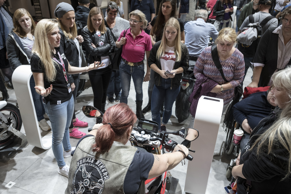 Auch auf dem gemeinsamen „Motorrad: aber sicher!“-Messestand von IVM und Bundesministerium für Verkehr und digitale Infrastruktur (BMVI) wurde in den täglichen Diskussions- und Interviewrunden das Thema „Motorradfahrerinnen“ behandelt. Eine Antwort auf das zugegeben bewusst provokante Motto der Gesprächsrunde „Fahren Frauen besser Motorrad?“ fanden auch Moderator Jens Kuck und seine Interviewpartnerinnen nicht – aber begeisterte Publikumsmassen waren gewiss, wenn „Motorradfrau“ Astrid Althoff demonstrieren ließ, wie auch durchaus zierliche Damen eine am Boden liegende 200 kg-Maschine mit der richtigen Technik problemlos wieder aufstellen und lediglich mit einem Finger fixieren.