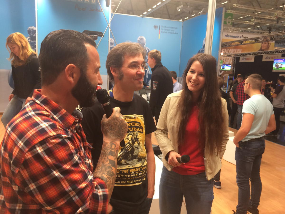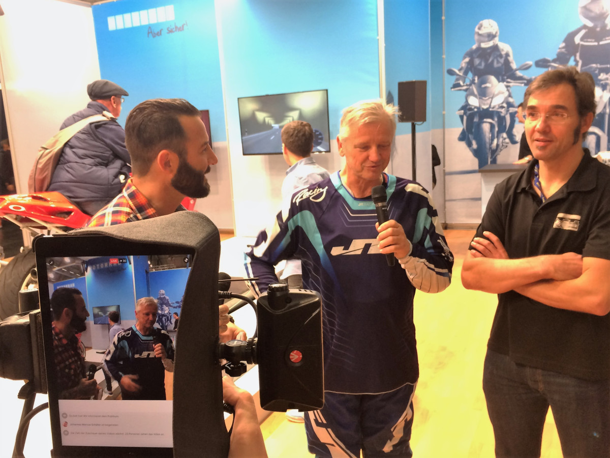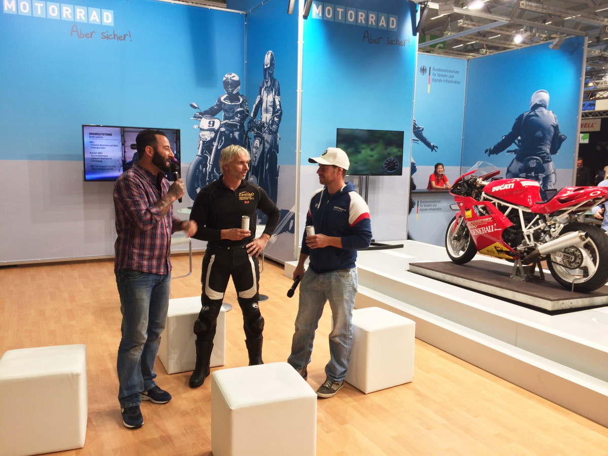 Moderator der „Motorrad: Aber sicher!“ – Filme war Jens Kuck, den der IVM nun während der INTERMOT als Talkmaster und Live-Reporter für den Stand des Bundesverkehrsministeriums gewinnen konnte. Täglich führte Kuck längere spannende Gespräche zum Thema Motorradsicherheit aus der Sicht des leidenschaftlichen Motorradfahrers und Ex-Racers. Gäste waren u.a. die „Dirt Docs“, der Zahnarzt Dr. Robert Allgaier und der Unfallchirurg Dr. Martin Hüning aus Berlin, die über sicheres Motorradfahren auf der Straße und dem Dirt-Track sprachen und im Außengelände die Dirt-Track-School betrieben, der Stuntfahrer Dirk Manderbach zusammen mit dem Fahrsicherheitstrainer Dirk Kersting, die für die Filmreihe „Assistenzsysteme für Motorradfahrer“ auf motorrad-aber-sicher.com als Fahrer und kompetente Ansprechpartner zur Verfügung standen. Es kam der ehemalige Yamaha-Produktentwickler Hennes Fischer, heute Berater von Yamaha Motor Europe, der sich mit Jens Kuck über die Entwicklung einer gemeinsamen „Sprache“ zwischen Motorrädern und Autos im Zeitalter des autonomen Fahrens unterhielt und u.a. das gemeinsame Connectivitäts-Gremium von BMW, Honda und Yamaha vorstellte. Christoph Gatzweiler und Reiner Brendicke vom IVM befragte Kuck über den Sinn von Assistenzsysteme für Motorradfahrer und über die gemeinsame Online-Kampagne „Motorrad: Aber sicher!“, die millionenfaches Interesse im Netz entfachte.