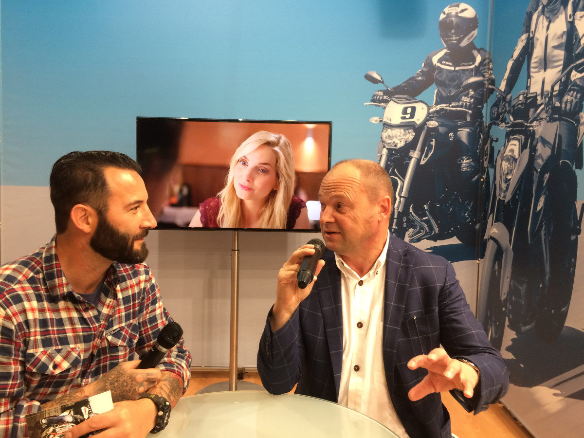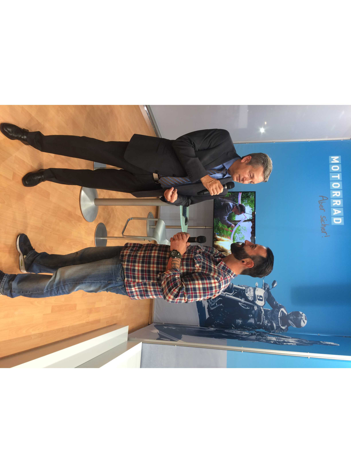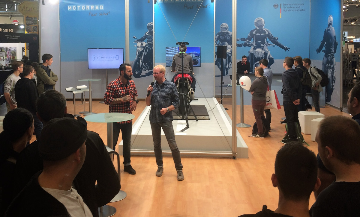 Moderator der „Motorrad: Aber sicher!“ – Filme war Jens Kuck, den der IVM nun während der INTERMOT als Talkmaster und Live-Reporter für den Stand des Bundesverkehrsministeriums gewinnen konnte. Täglich führte Kuck längere spannende Gespräche zum Thema Motorradsicherheit aus der Sicht des leidenschaftlichen Motorradfahrers und Ex-Racers. Gäste waren u.a. die „Dirt Docs“, der Zahnarzt Dr. Robert Allgaier und der Unfallchirurg Dr. Martin Hüning aus Berlin, die über sicheres Motorradfahren auf der Straße und dem Dirt-Track sprachen und im Außengelände die Dirt-Track-School betrieben, der Stuntfahrer Dirk Manderbach zusammen mit dem Fahrsicherheitstrainer Dirk Kersting, die für die Filmreihe „Assistenzsysteme für Motorradfahrer“ auf motorrad-aber-sicher.com als Fahrer und kompetente Ansprechpartner zur Verfügung standen. Es kam der ehemalige Yamaha-Produktentwickler Hennes Fischer, heute Berater von Yamaha Motor Europe, der sich mit Jens Kuck über die Entwicklung einer gemeinsamen „Sprache“ zwischen Motorrädern und Autos im Zeitalter des autonomen Fahrens unterhielt und u.a. das gemeinsame Connectivitäts-Gremium von BMW, Honda und Yamaha vorstellte. Christoph Gatzweiler und Reiner Brendicke vom IVM befragte Kuck über den Sinn von Assistenzsysteme für Motorradfahrer und über die gemeinsame Online-Kampagne „Motorrad: Aber sicher!“, die millionenfaches Interesse im Netz entfachte.