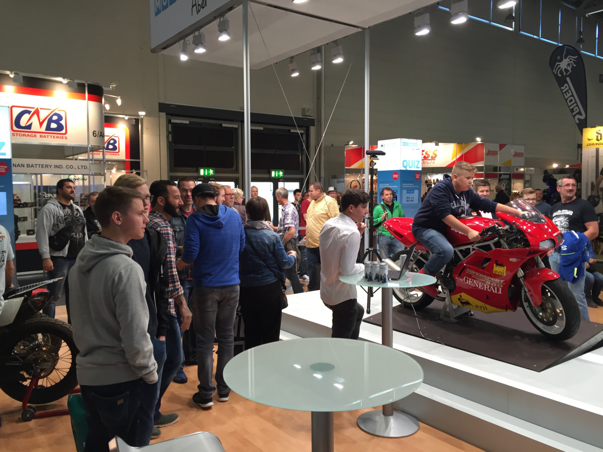 Jens Kuck 99 Minuten Live, er startet in Halle 6 bei BMW-Motorrad, wühlt sich moderierend durch die Menschenmenge in die Hallo 9 zu Triumph, KTM, Honda und Harley-Davidson …