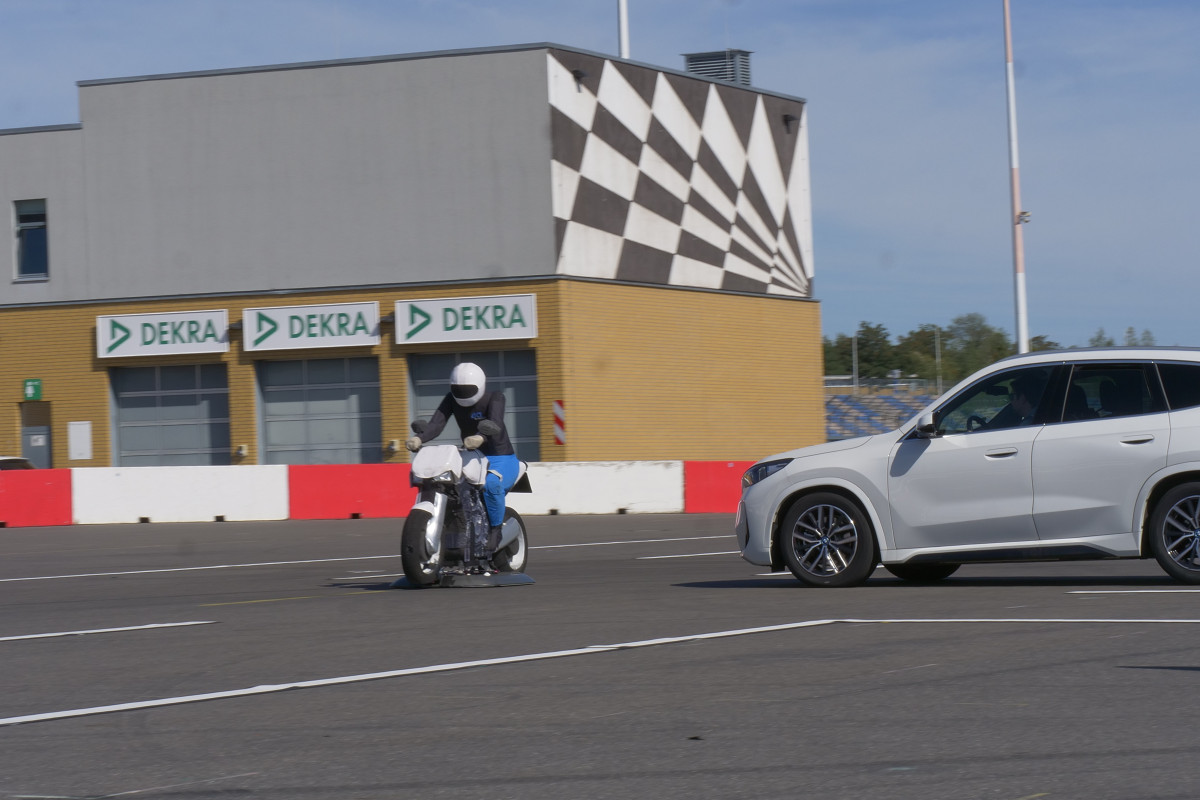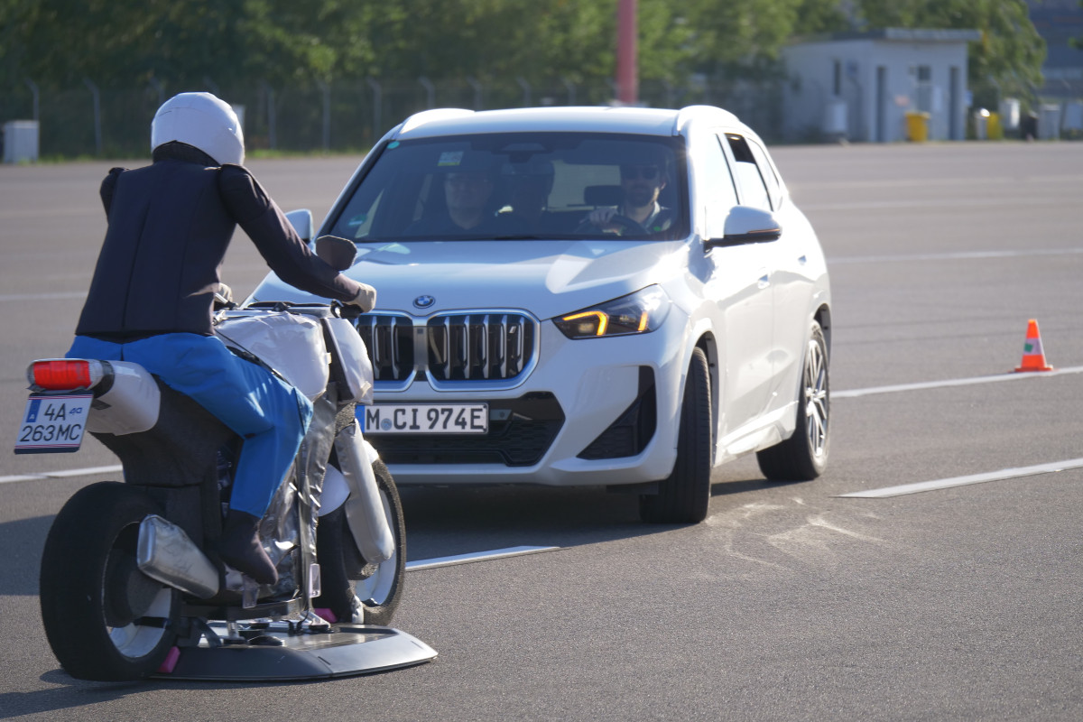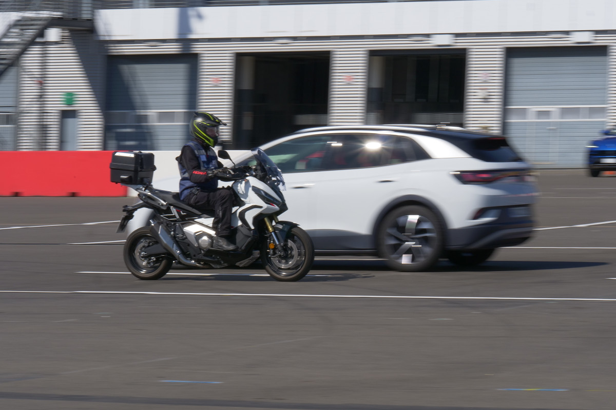 Die Location bot hervorragende Rahmenbedingungen und auch das Wetter spielte mit. Dem zahlreich erschienenen Fachpublikum wurden mit realen Fahrzeugen unterschiedliche Verkehrssituationen vorgeführt. Dabei ging es in erster Linie um Konfliktsituationen zwischen PKW und Motorrad, in denen das Motorrad übersehen oder zu spät wahrgenommen wird. Genau solche Situationen also, in denen Fahrassistenzsysteme und perspektivisch Cooperative Intelligent Transport Systems (C-ITS) wirken und Kollisionen vermeiden helfen.